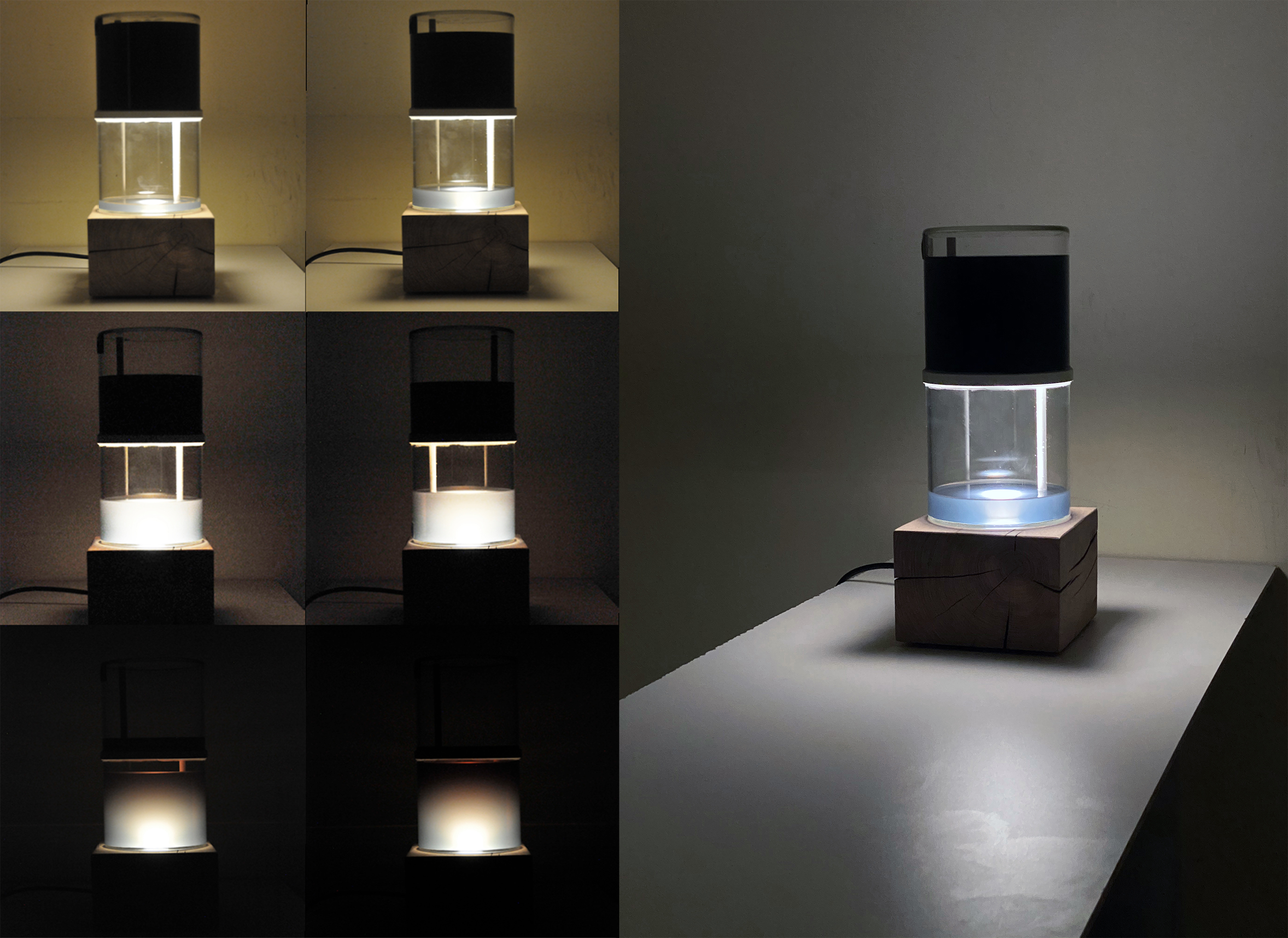 An hourglass filled with black water that slowly causes the light of a lamp beneath it to fade out.